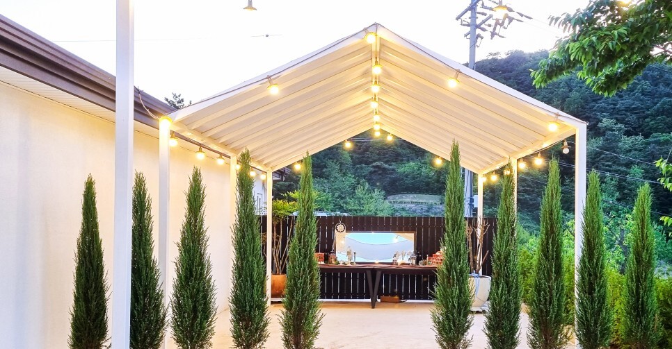 애견동반가능한 자리는 실외에도 마련되어 있는데요, 큰 잔디밭 주위에 텐트의 형태로 자리해 있어 날씨가 선선해지면 더 좋을 것 같은 곳이었습니다.