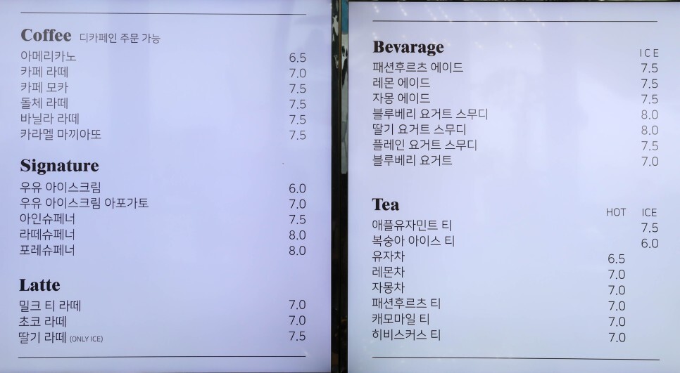 | 포레슈페너8,000원 우유 아이스크림 아포가토7,000원 라떼슈페너8,000원 밀크티라떼7,000원 초코라떼7,000원 딸기라떼7,500원 패션후르츠에이드7,500원 레몬에이드7,500원 자몽에이드7,500원 블루베리스무디8,000원 딸기스무디8,000원 플레인요거트스무디7,500원 상하목장 우유 아이스크림6,000원 떠먹는블루베리요거트7,000원 애플유자민트티7,500원 복숭아아이스티6,000원 유자차6,500원 레몬 티7,000원 자몽티7,000원 패션후르츠티7,000원 캐모마일티7,000원 히비스커스티7,000원 아메리카노6,500원 카페라떼7,000원 카페모카7,500원 돌체라떼7,500원 바닐라라떼7,500원 카라멜마끼아또7,500원 아인슈페너8,000원 |