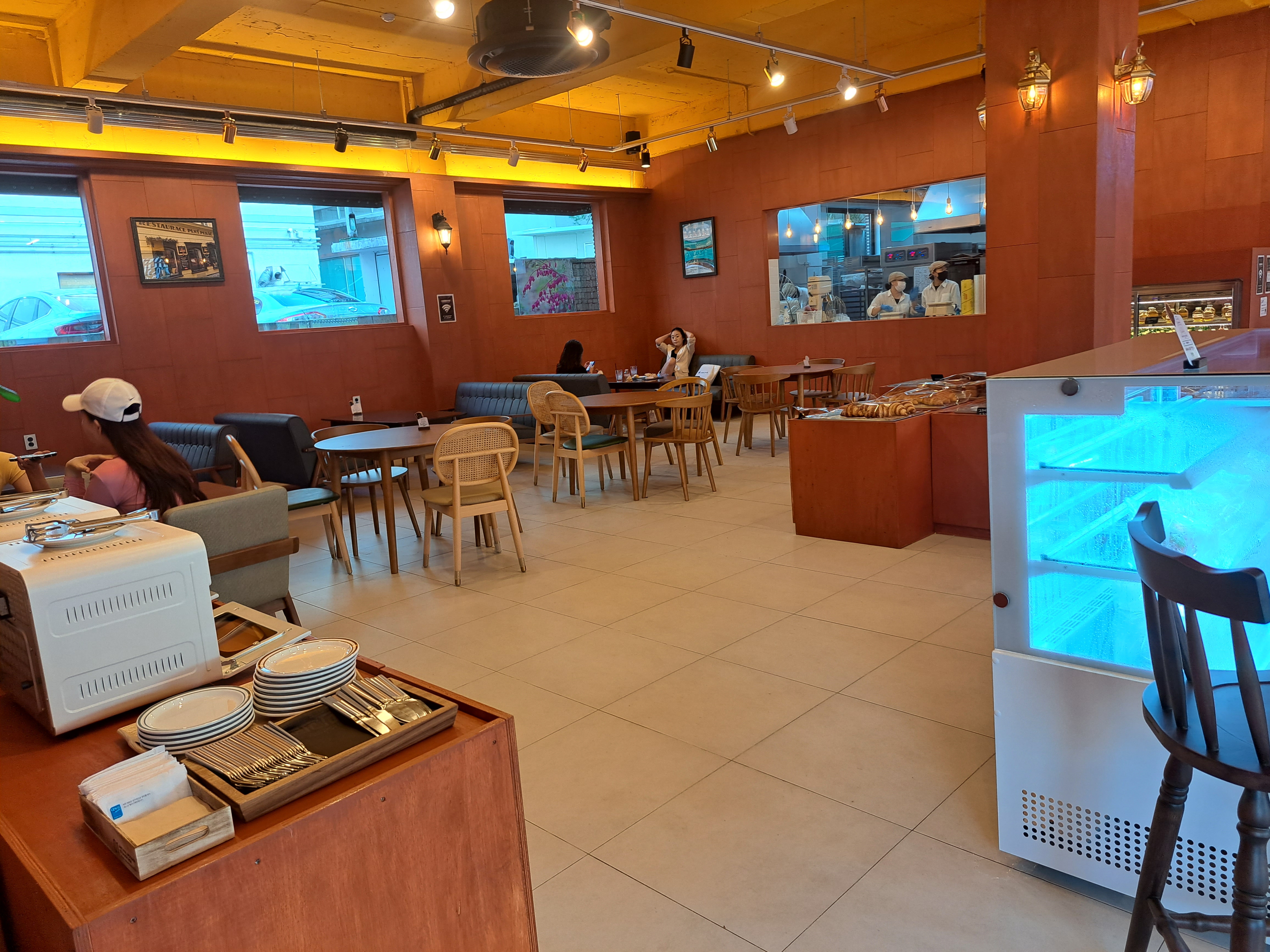 여자들이 많네요 1층에서 빵 받아서 2층에 가서 먹기로 합니다.