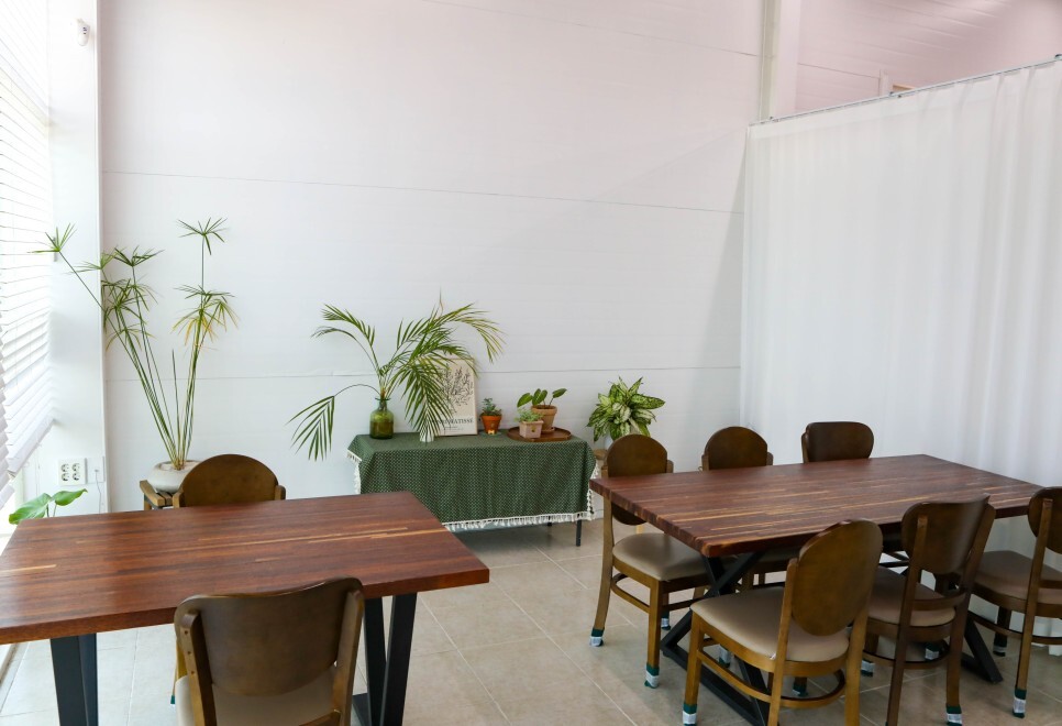 우드톤의 식탁과 식물의 조합이 사무실 같기도 하고 조화롭네요