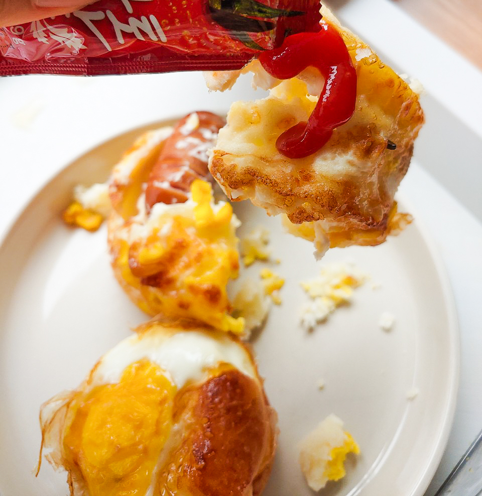 케첩도 함께 나와서 계란빵에 발라 먹으면 맛있습니다. 안 그래도 계란후라이에 소금 안치고 이렇게 먹는 편인데 딱이네요