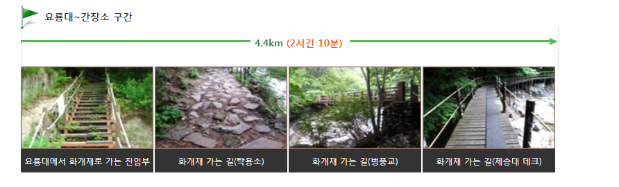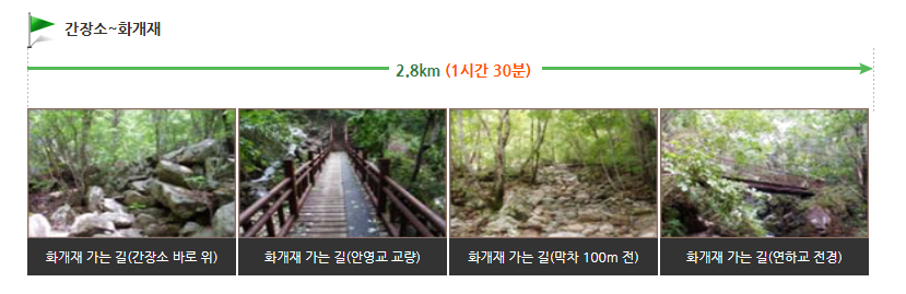 간장소~화개재 구간은 돌길이 또 많으며, 약 9개의 교량을 지나가게 되며 그 동안 왔던 길보다 경사가 심하며, 약 2.8㎞ 구간에 소요시간은 대략 1시간 30분정도 소요됩니다.
