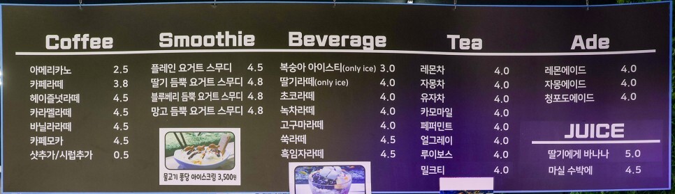 메뉴판입니다. 핵가성비의 아메리카노 2500원이 인상적이네요 물고기 아이스크림도 파네요 물고기 먹이인가 봅니다.