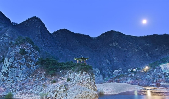 월류봉에서 눈에 띄는 정자 월류정은 신비한 느낌이 듭니다.