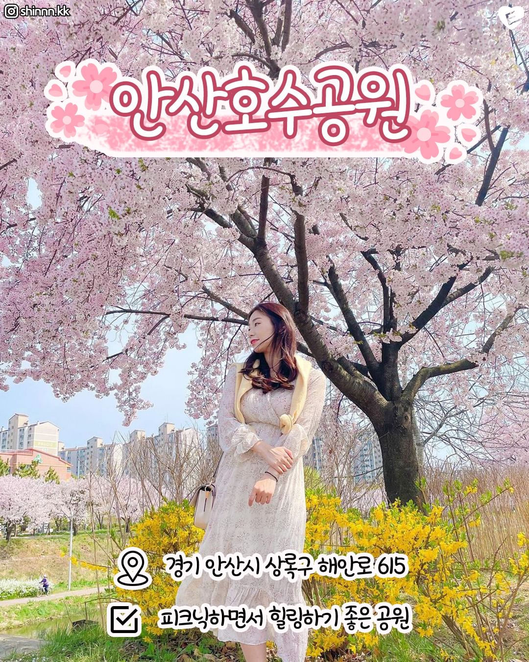 ▷추천 이유: 안산호수공원은 안산시 상록구에 위치한 공원으로, 호수 주변에 약 1,000여 그루의 벚나무가 심어져 있습니다. 봄이 되면 벚꽃이 만개하여 장관을 이루며, 많은 사람들이 벚꽃을 감상하기 위해 이곳을 찾습니다.