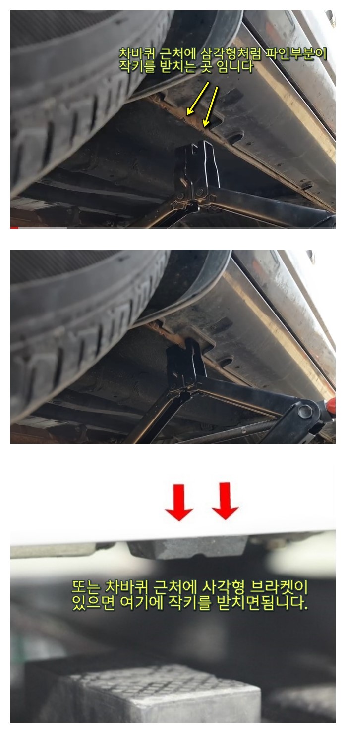 엉뚱한 곳에 작키를 받치면 차무게로 인하여 작키 받친곳이 찌그러지거나 파일 수도 있으니...