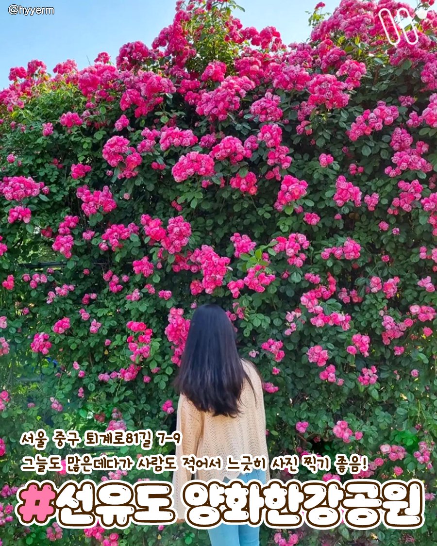 강변 풍경: 한강을 배경으로 한 장미 사진을 찍을 수 있는 곳입니다.