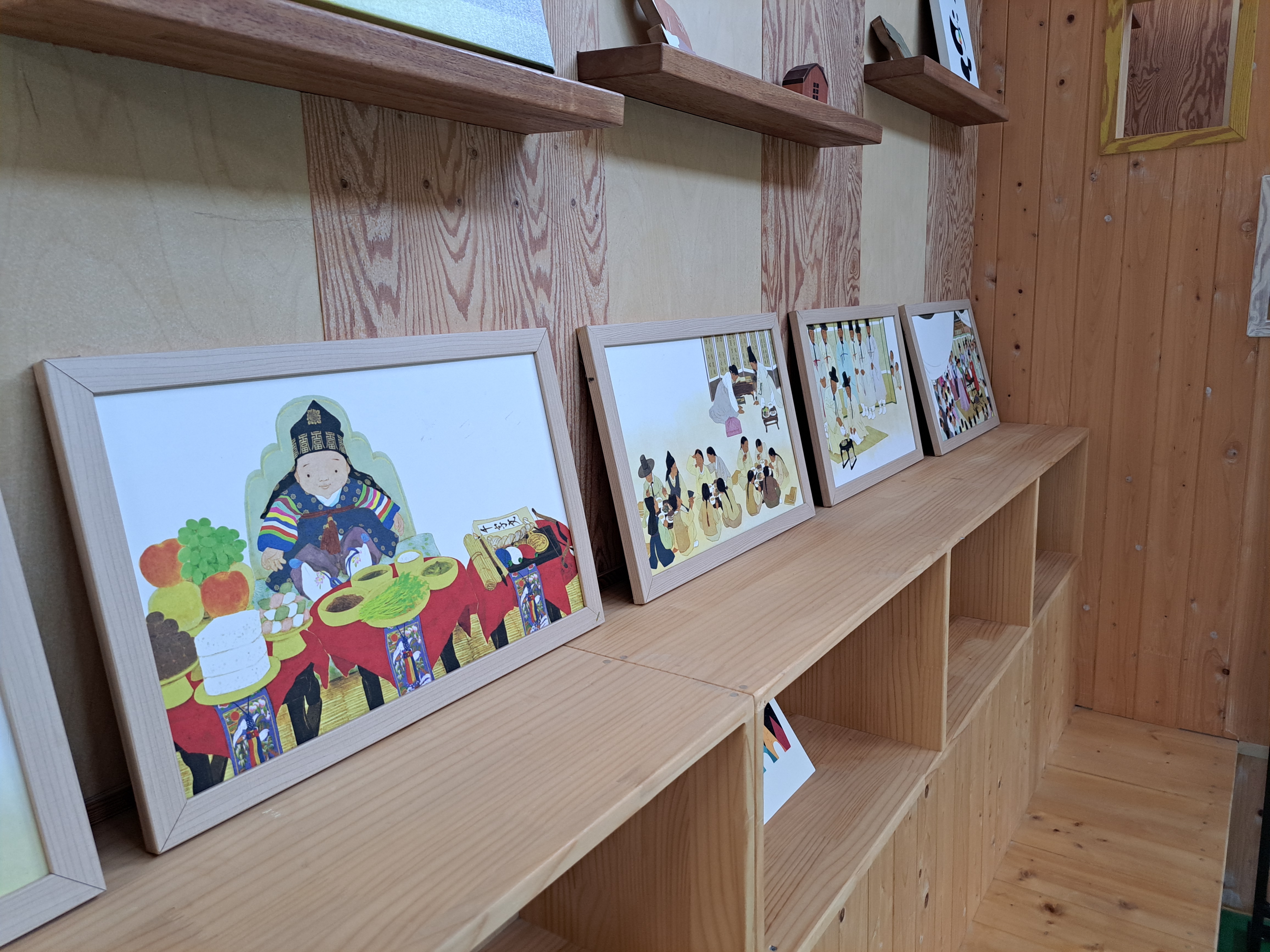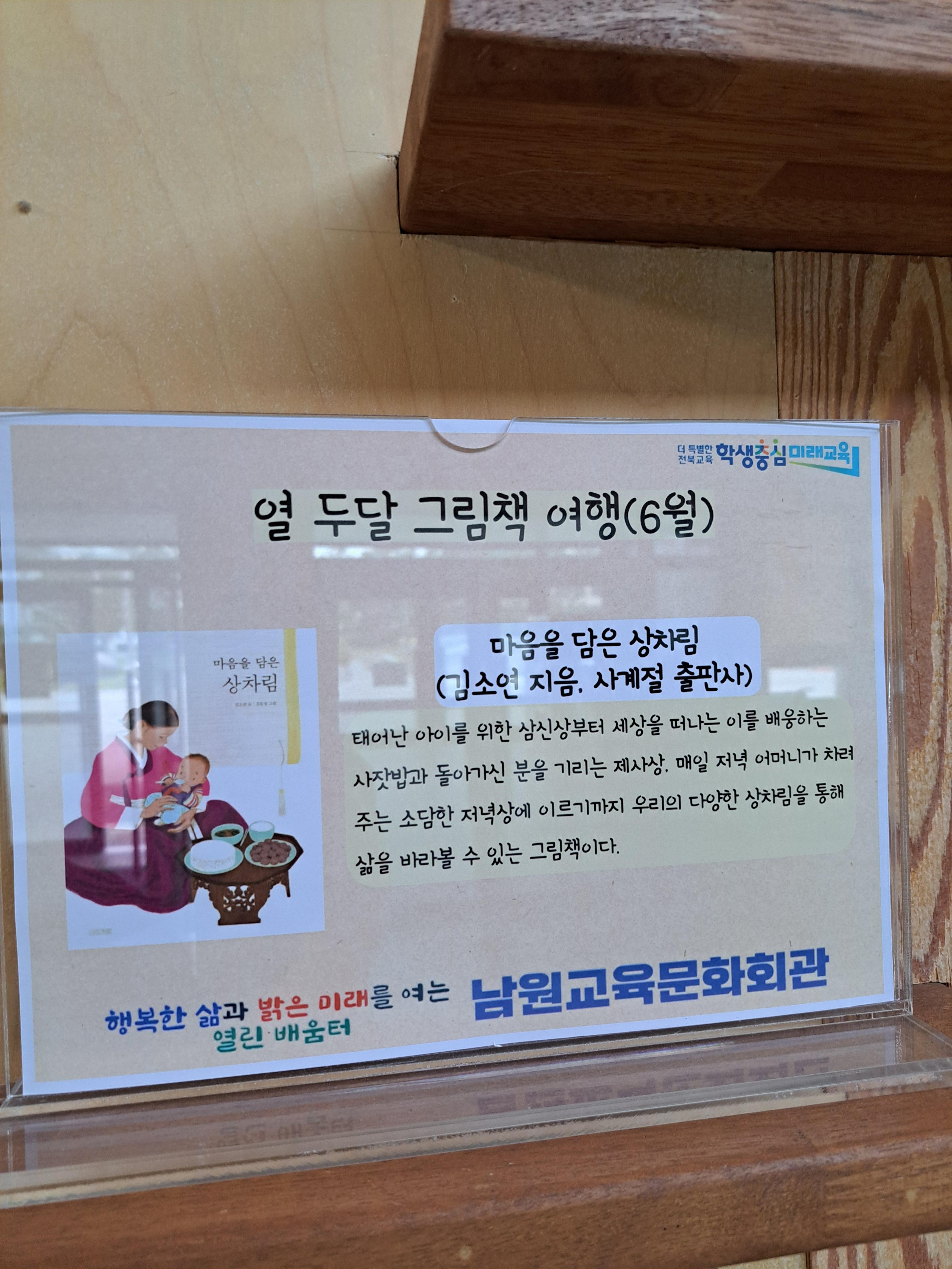 남원교육문화회관 1층로비에서 열두달 그림책 여행 6월 전시 작품으로 [마음을 담은 상차림] 그림책에 관련된 전시가 되어있습니다.