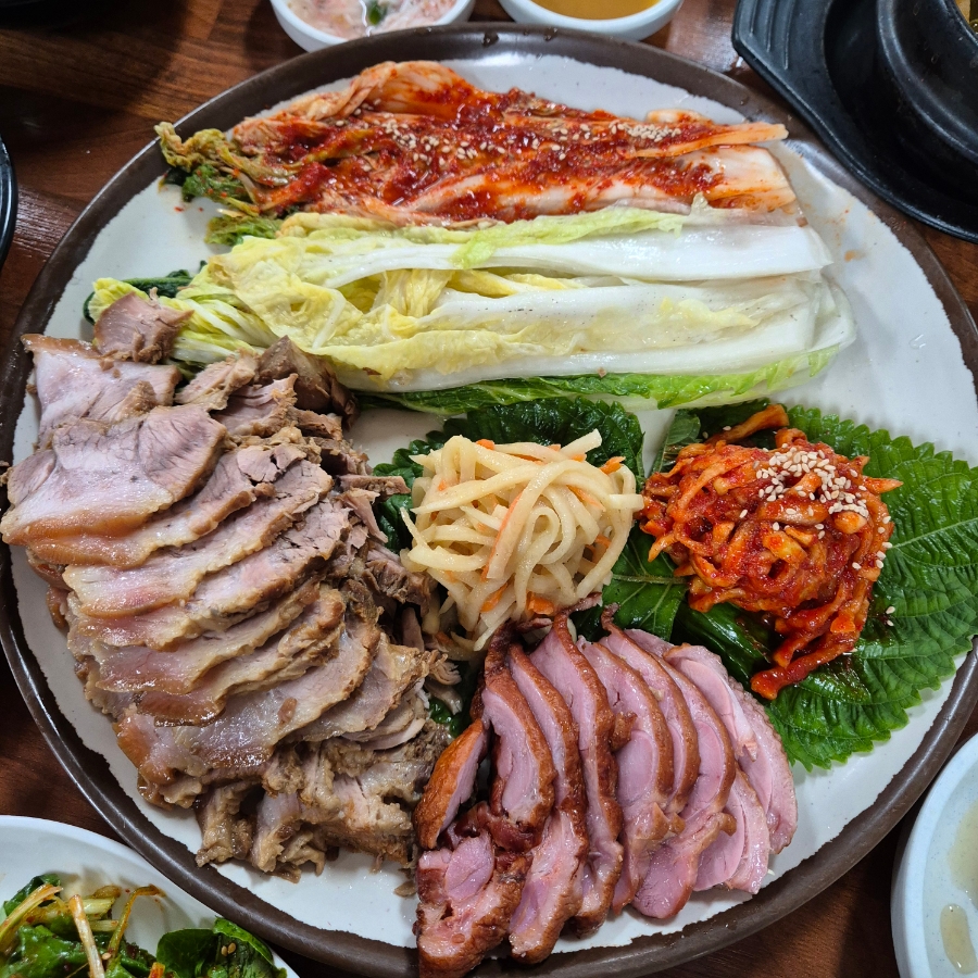 잘 익어서 오리훈제고기와 보쌈은 부드럽습니다.