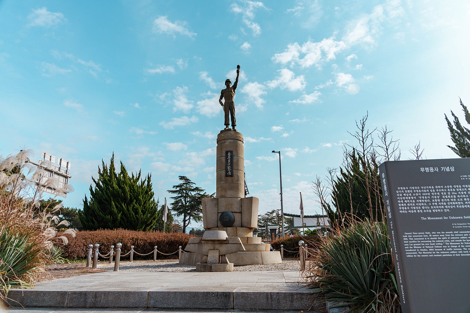 향토문화유적 제32호로써 연무대 정문 앞 30미터 지점에 백남권 소장이 1958년 건립한 것으로 알려져 있습니다. 이승만 대통령이 '무명용사 기념상' 친필 휘호를 하사하였으며, 연무대의 교통량이 증가하면서 현재는 연무 현충공원에서 자리를 지키고 있습니다. 꺼지지 않는 횃불을 들고 있기에 호국의지와 애국심을 후손들에게 알리고 영원히 마음속에 간직하기를 바라며 세워졌기에 바라보는 내내 마음이 뭉클하였습니다.