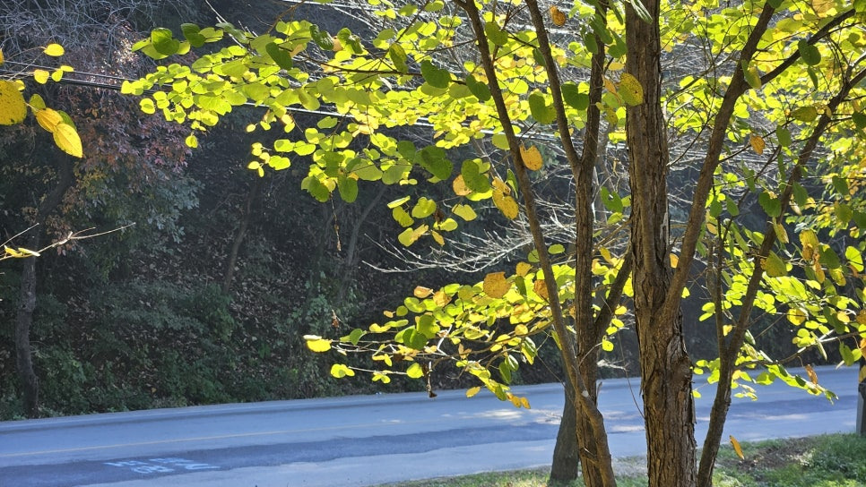 걷다 보니 달콤한 솜사탕 냄새가 바람에 솔솔 흘러오는데요, 역시 계수나무가 있었어요. 노랗게 물든 계수나무잎들이 햇살에 투명하게 비치고 있는 데다가 달달한 솜사탕 내음까지 풍기고 있어서 또 다시 발걸음이 멈춰집니다.