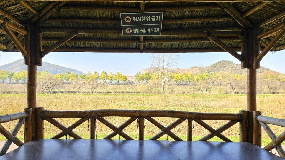 정안천 생태공원의 풍경을 한눈에 볼 수 있는 큼지막한 정자도 중간에 있으니 가족이나 친구들과 함께 나들이 왔을 때 여기에서 머물며 시간을 보내는 것도 추천 드려요. 필요하면 사용할 수 있는 빗자루도 있고요, 관리가 너무 깨끗하게 잘 되어 있었어요. 반들반들한 거 보이시죠?