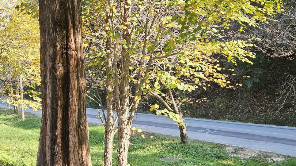 따스한 가을 햇살이 무성한 잎들 사이로 내리쬐어서 두터운 기둥 사이를 걷는 기분은 더 몽환적입니다. 단단한 나무 몸통도 인상적이지만, 워낙 하늘 높이 자라는 터라 메타세쿼이아 숲 안을 걸으면 여름에는 그늘을 만들어주는 데 최고죠. 가을에는 물들어가는 여러 색을 만날 수 있습니다. 그런데 요즘 갑자기 추워져서 가을색으로 물들기도 전에 눈이 내려버리는 게 아닐까 하는 생각도 드네요.