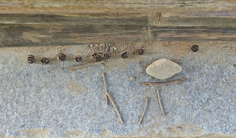 이곳을 다녀간 누군가가 예쁜 흔적을 남겨두었더라고요. 솔방울과 나뭇가지로 이름을 써 놓았던데 좋은 추억을 만들었겠죠? 자연이 남긴 것들로 장식된 바닥을 보니 미소가 저절로 지어졌어요.