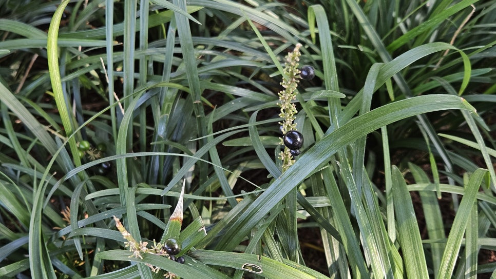 숲길 아래에 무성하게 자란 맥문동은 보라색 꽃을 한참 피워낸 후 지금은 동그란 열매를 매달고 있습니다. 계절마다 색다른 뷰를 보여주는 공주 메타세쿼이아 길이에요. 겨울에는 하얀 솜털 이불을 덮은 듯 또 다른 모습을 변할 거고요.