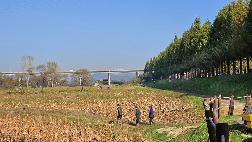 지금은 바짝 말라 있지만 나무 아래에는 이렇게 맨발 걷기에 좋은 황토길도 마련되어 있습니다. 생태공원 둘레를 걸을 수도 있을 뿐 아니라 피톤치드 맡으며 메타세쿼이아 바로 아래에서도 산책할 수 있어요. 지금은 맨발로 걷기에 너무 차가울 듯해요. 내년 따스한 봄이 오면 걸어보고 싶어집니다.